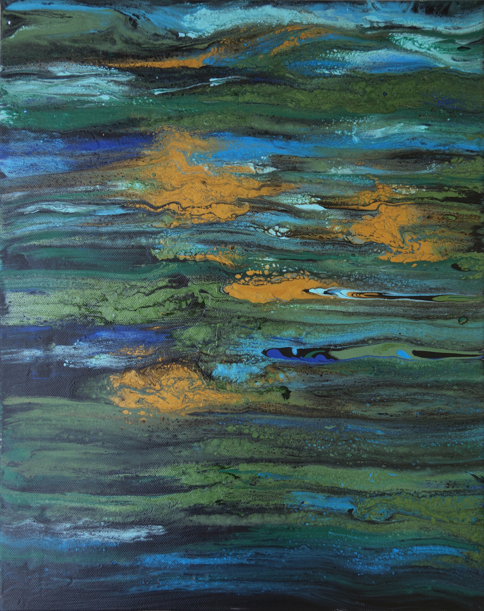 „Meeresrauschen II“ trägt die Atmosphäre tiefer, fließender Bewegung in sich. Dunkle Blau- und Grüntöne überlagern sich in rhythmischen Schichten, durchzogen von goldenen Akzenten, die wie Lichtreflexe auf Wasser erscheinen. Das Werk vermittelt die Energie des Ozeans – kraftvoll und zugleich beruhigend –, ein Wechselspiel zwischen Tiefe und Leichtigkeit, Stille und beständigem Pulsieren. Es ist ein visuelles Echo des Meeres, das die Seele in Schwingung versetzt.