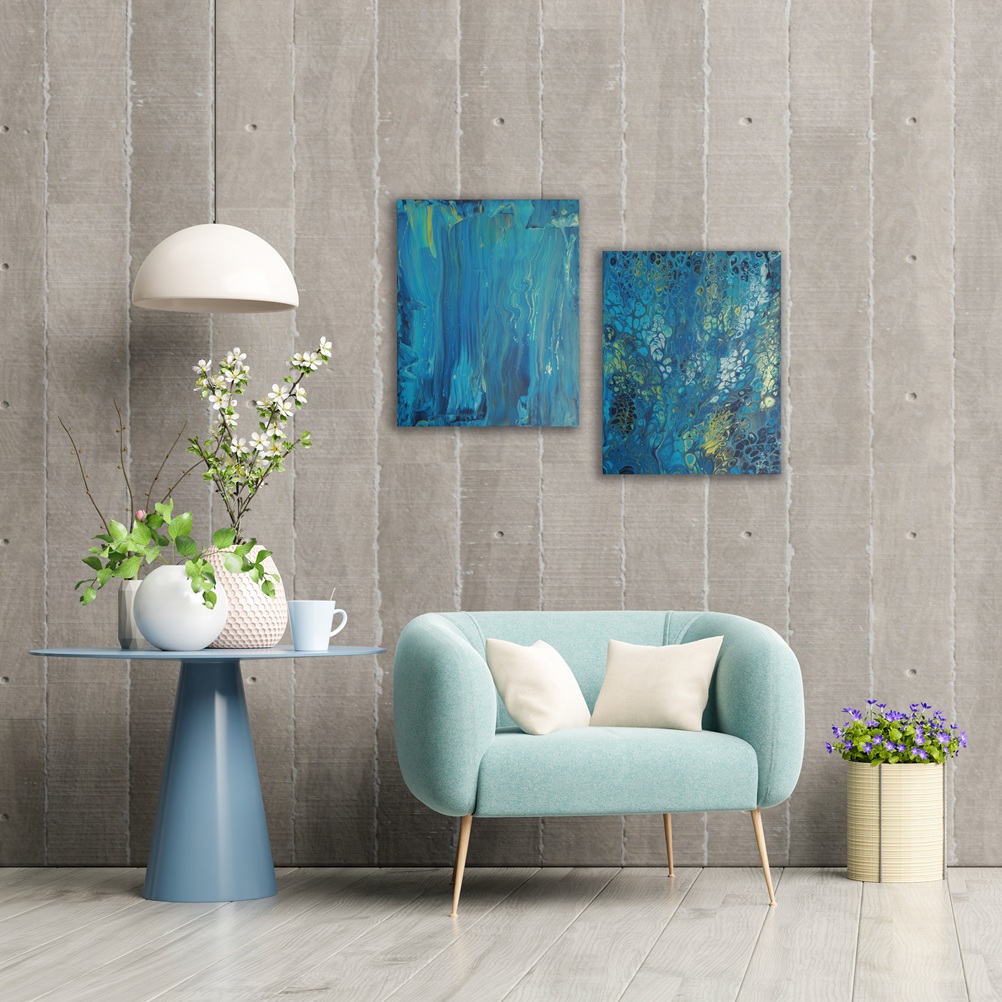 „Prickelndes Wasser“ sprüht vor Lebendigkeit und Bewegung. In einem Spiel aus Blau, Türkis, Grün und Gold entfalten sich unzählige kleine Formen wie tanzende Blasen im Licht. Das Werk fängt den Moment ein, in dem Wasser zu Energie wird – kühl, klar, pulsierend. Es erinnert an das Gefühl von Frische, an Leichtigkeit und an das Aufsteigen von Freude. Ein Bild voller Dynamik und Transparenz – wie ein lebendiger Atemzug aus Farbe und Licht.