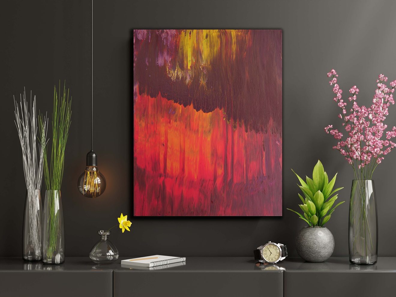 „Sonnenaufgang im Moor“ ist ein Bild voller Gegensätze – flammende Lichtfülle trifft auf dunkle, schwer wirkende Formen. Die leuchtenden Orange- und Rottöne steigen auf wie Nebelschwaden im Morgenlicht, durchzogen von geheimnisvollem Violett und erdigem Braun. Das Werk fängt das kraftvolle Erwachen der Natur in einem Zwischenraum ein – zwischen Nacht und Tag, Nebel und Klarheit, Verborgenem und Sichtbarem. Die vertikale Dynamik lässt die Szene wie einen durch Licht durchströmten Vorhang erscheinen. Ein intuitiv entstandenes Werk, das Kraft und Stille gleichermaßen ausstrahlt.