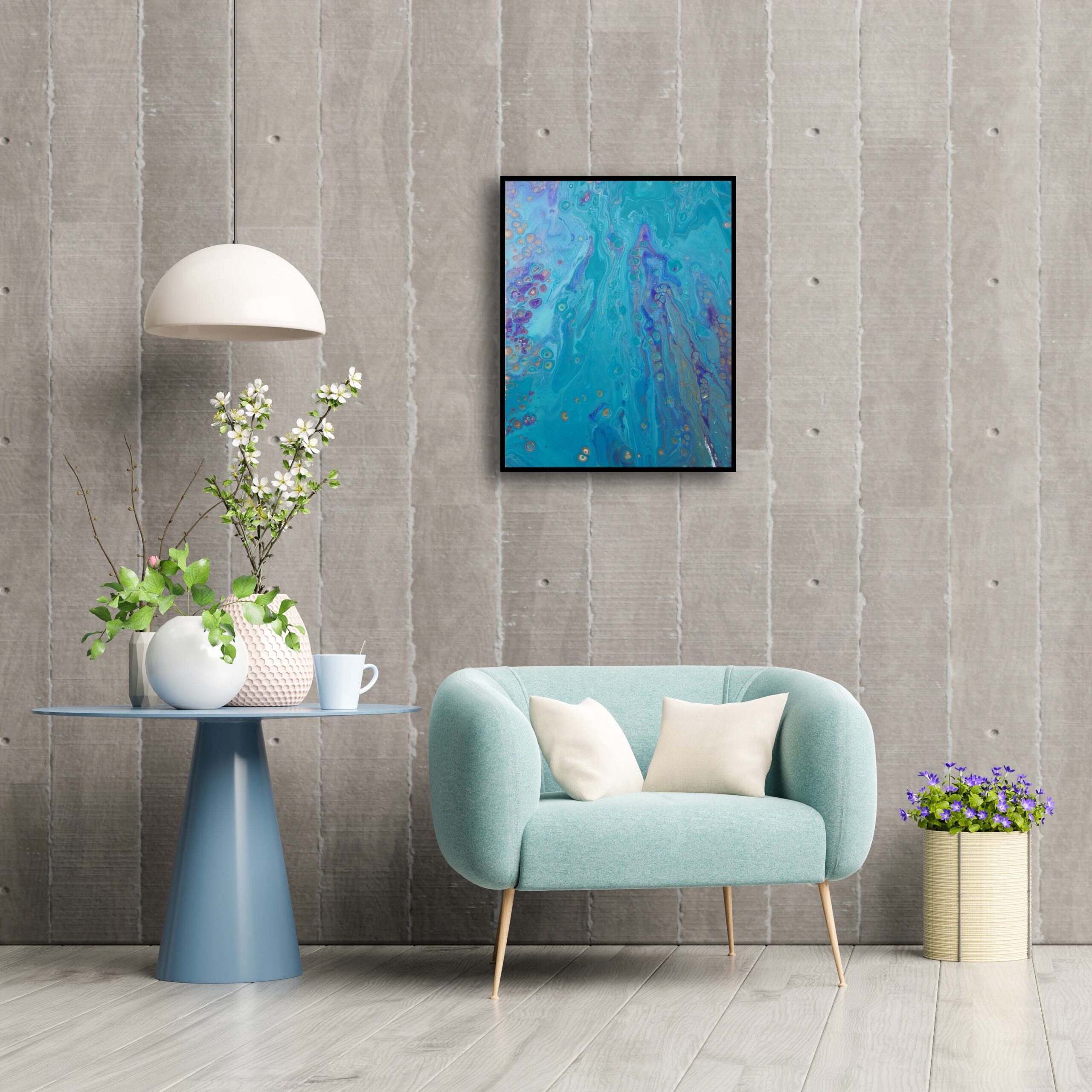 „Spirit I“ ist ein Werk, das feinstoffliche Energien sichtbar macht. Türkis, Violett und Goldtöne fließen sanft über die Leinwand wie ein Lichtstrom aus einer höheren Ebene – fließend, leicht und voller Schwingung. Die weichen Strukturen und irisierenden Farbverläufe lassen an eine Aura, eine geistige Landschaft oder spirituelle Verbindung denken. Dieses Bild lädt nicht zum Nachdenken ein, sondern zum Fühlen – zur Rückverbindung mit dem inneren Raum. Ein meditatives Werk – still, tief und offen für das Unsichtbare.