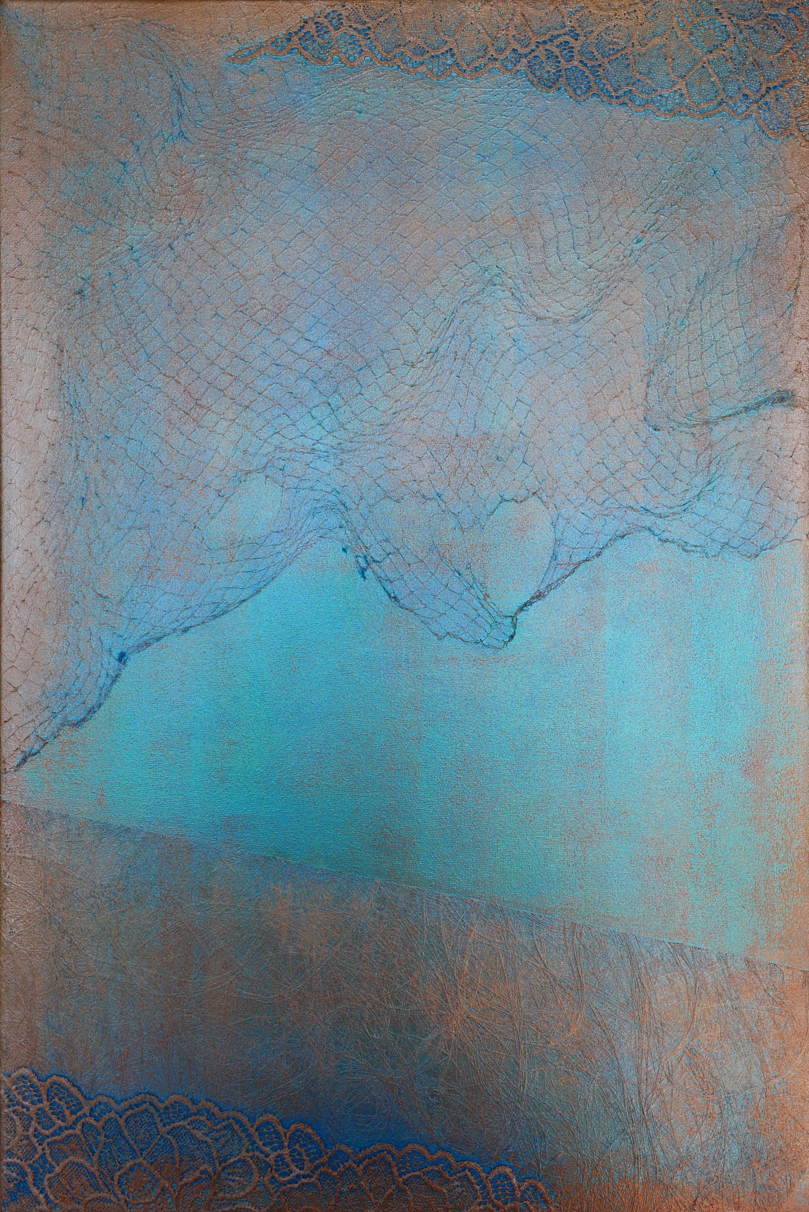 „Weder Gestern noch Morgen“ ist ein stilles, zeitloses Werk – ein Hauch aus Blau, Bronze und Licht. Feine Spitzen- und Netzstrukturen ziehen sich über die Oberfläche wie Spuren von Erinnerung, ohne sich festzuhalten. Die zarten Farbverläufe scheinen zwischen Materie und Atmosphäre zu schweben, als wäre das Bild selbst ein Moment zwischen Atemzügen. Es erzählt von Gegenwärtigkeit – vom Innehalten, vom Sein im Jetzt. Ein Werk, das Stille hörbar macht.