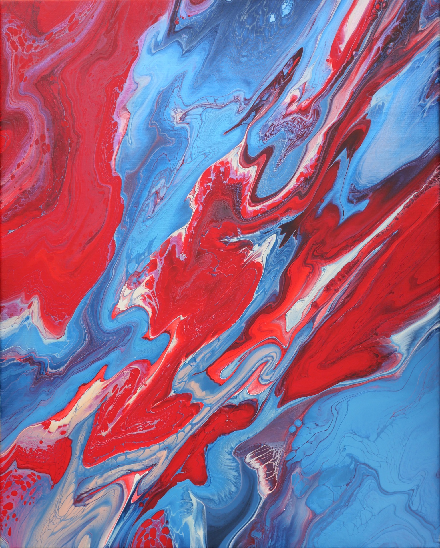 „Wiedergeburt II“ ist ein leidenschaftlicher Ausdruck von Wandlung – voller Bewegung, Farbe und innerer Kraft. Die Komposition wirkt wie eine energetische Strömung, in der sich rote und blaue Flächen begegnen, überlagern und sich neu formieren. Das Bild steht sinnbildlich für Transformation: alte Strukturen brechen auf, neue entstehen. Es ist der zweite Teil einer kraftvollen Serie, die sich mit dem inneren Akt der Wiedergeburt beschäftigt – mit Mut, Chaos, Klarheit und dem Gefühl, lebendig zu sein. Ein Werk, das inspiriert – nicht durch Ruhe, sondern durch Bewegung und Präsenz.